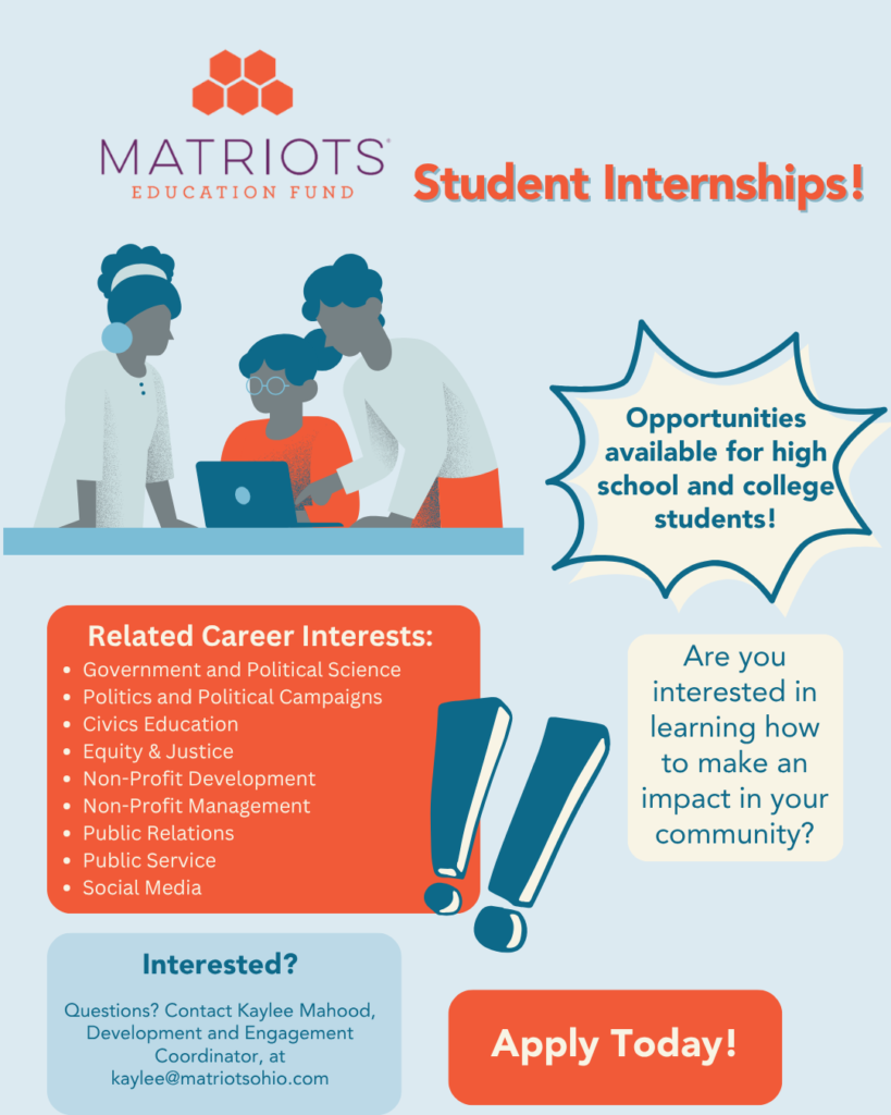 If you have any questions, please reach out to Kaylee McKee at kaylee@matriotsohio.com. We will reach out regarding next steps and interviews.